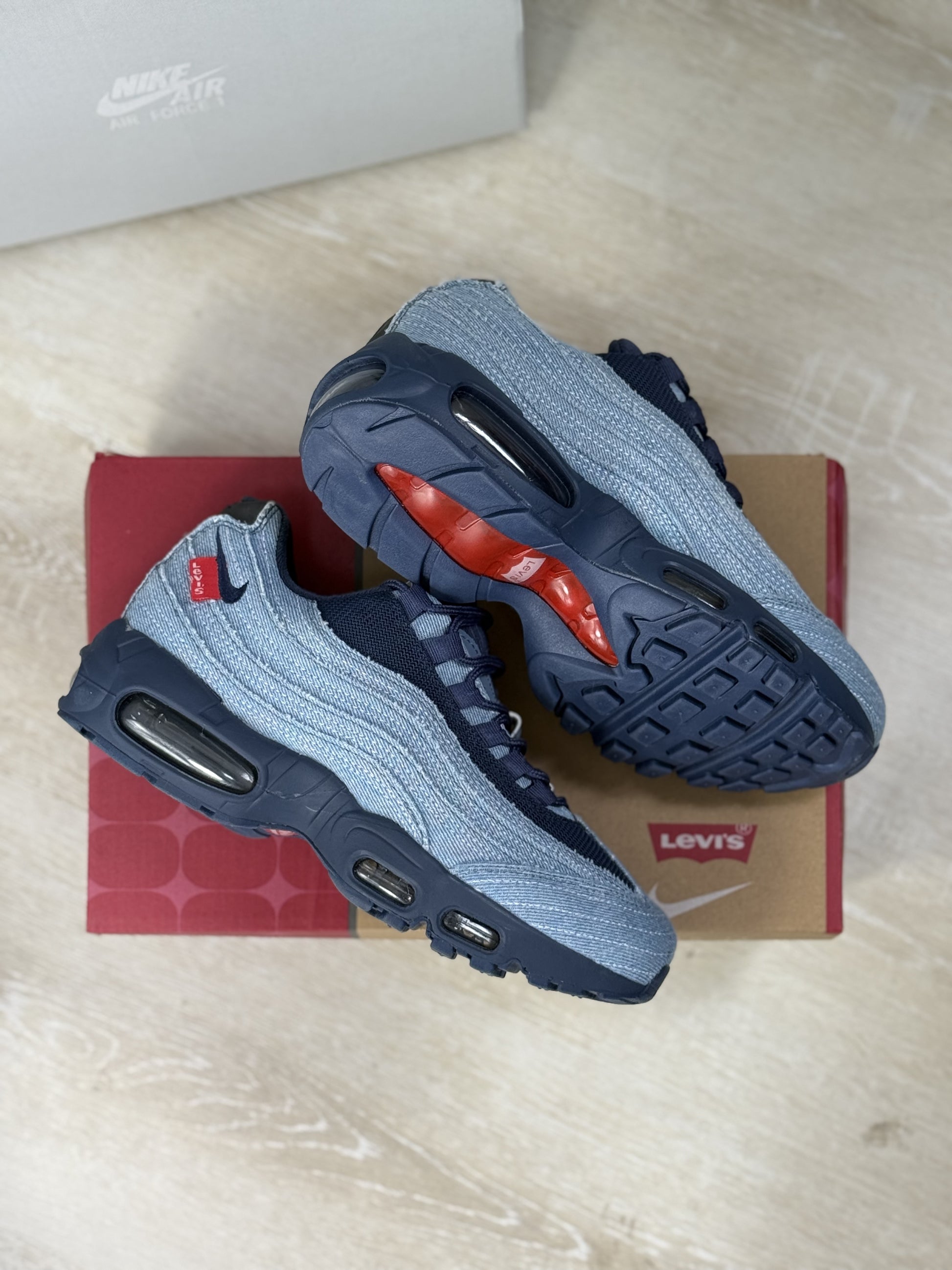 Los Nike x Levi's Air Max 95 combinan diseño, comodidad y estilo moderno en un solo par. Su upper está construido con capas en degradado azul claro hacia azul marino, creando un look visualmente atractivo y fácil de combinar.